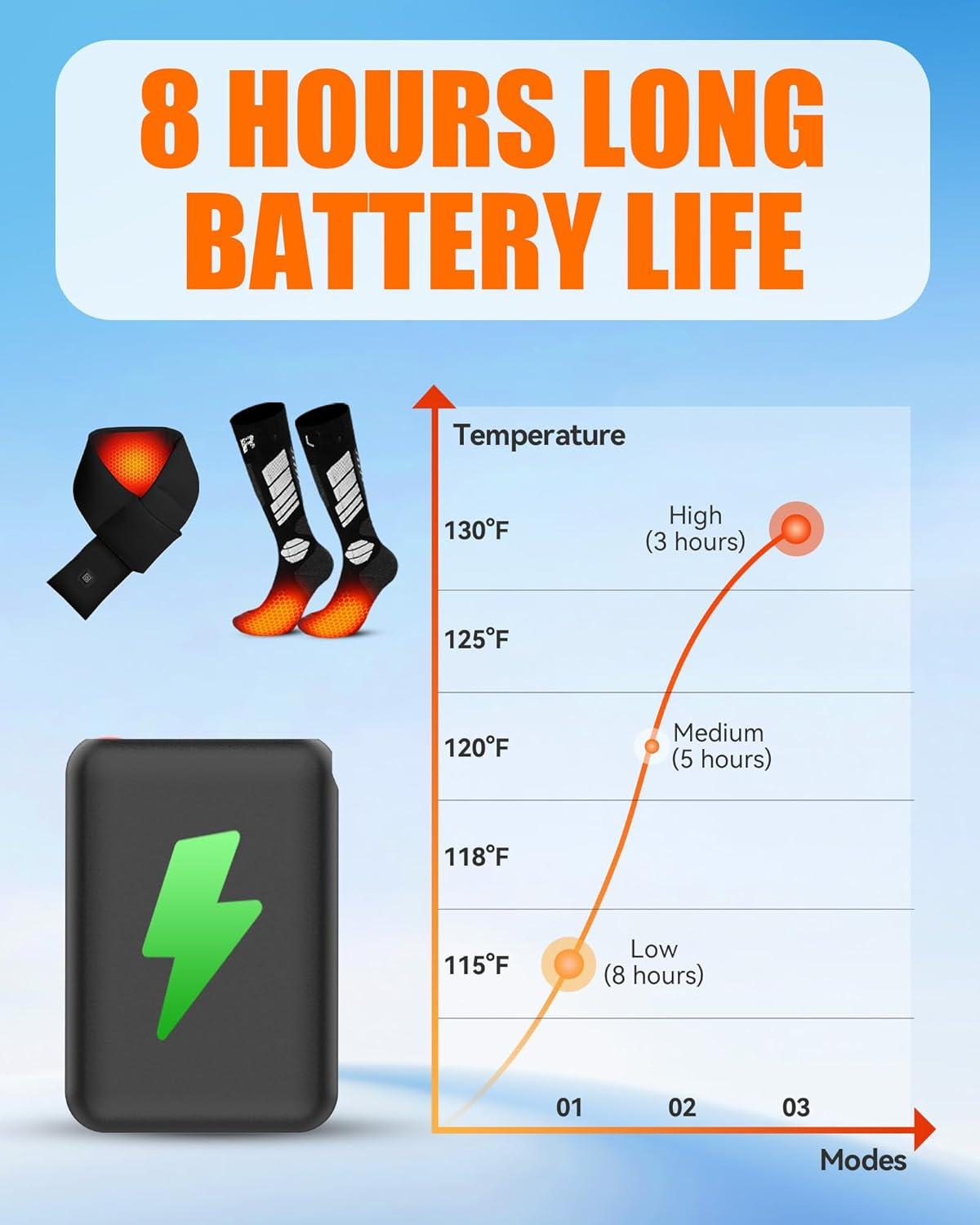 【BATTERY PACK for HEATING GLOVES and SOCKS】 Experience continuous and stable power output for your heated clothing with our professionally customized battery. It's safe, reliable, and compatible with a range of heated devices such as gloves, scarves, socks, slippers, and heating coats. Note: This battery is not recommended for gloves or socks with on/off buttons, this battery is designed for gloves and socks without on/off buttons.