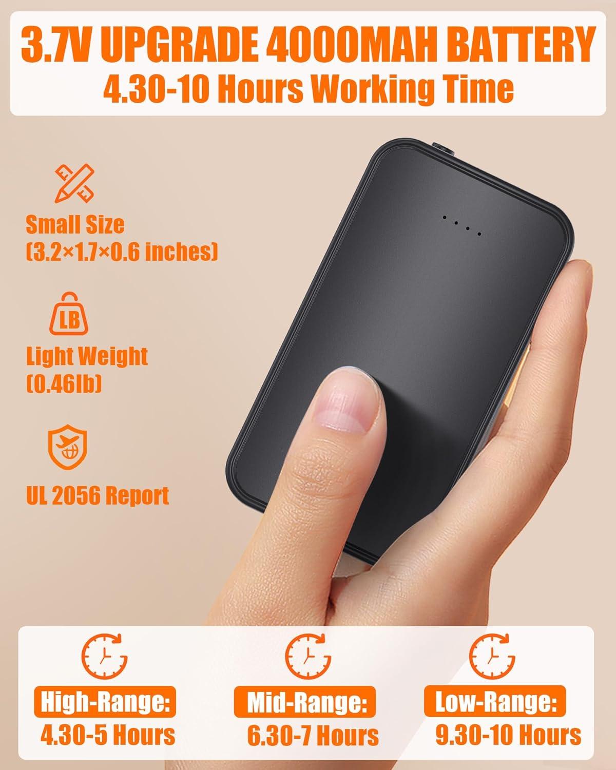 【Upgraded 4000mAh Ultra-Light Battery Pack】Equipped with a 3.7V2A DC interface battery, this 4000mAh battery comes with a 10W charging accessory (fully charged in just 3-4 hours). Ultra-light and ultra-thin (1 battery only 0.19 lbs and 3.2×1.7×0.6 inches), it won’t weigh your shoes down. Enjoy up to 10 hours of warmth: High (130°F):** 4.30–5 hours* **Medium (120°F):** 6.30–7 hours* **Low (115°F):** 9.30–10 hours.